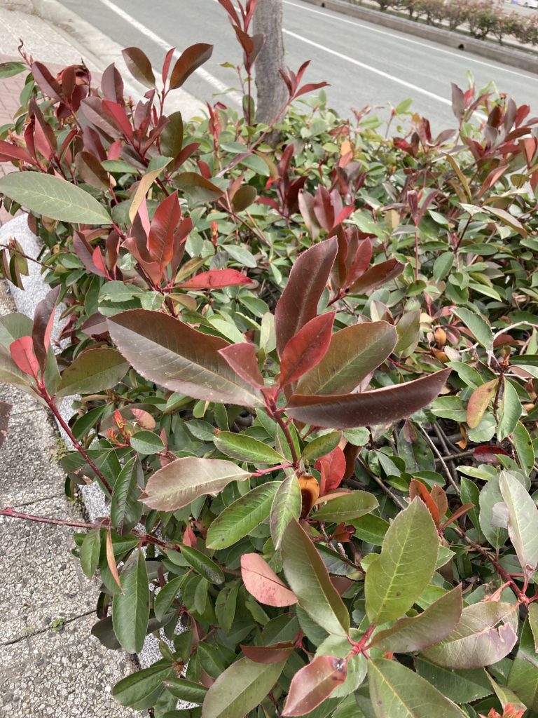 ベニカナメモチ(紅カナメモチ)という植物である。レッドロビンとも呼ばれ、春になると新芽が鮮やかな赤に染まり、非常に目を引く。しばらくすると赤い葉が緑色へと変化していき、季節のうつろいを静かに物語る。